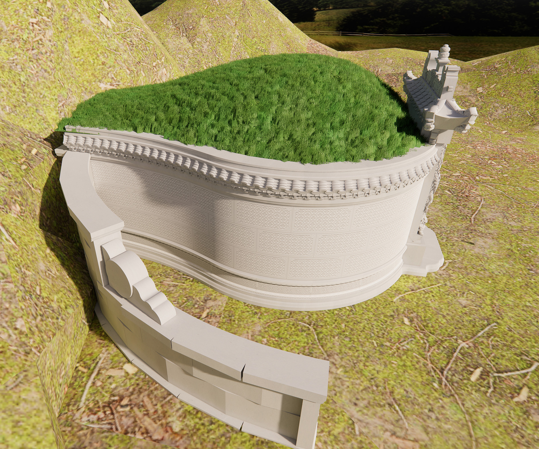 围手布局:环抱型围手设计,打破常规布局。从风水角度,聚拢气场,让整个陵墓与周边风景更“紧气”,形成和谐且独特的空间氛围;从视觉看,强化整体规整感与仪式感,成为一片陵园中辨识度极高的存在。